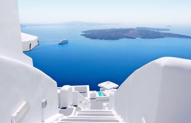 圣托里尼岛是希腊的一个岛屿,位于爱琴海中间。这个小岛以世界上最令人叹为观止的景观而闻名,它的白色房屋和建筑都是沿着崎岖的海岸线建造的。在这里,你可以站在白色的阶梯上眺望天边的海岸线。