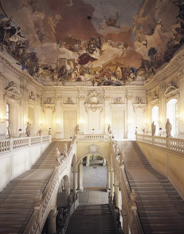 位于德国南部的维尔茨堡官邸建于18世纪中叶,是巴洛克式建筑的典范。这座建筑最引人注目的部分是它的主楼梯,主楼梯上方是迄今为止世界上最大的湿壁画,主题为当时认知的世界四大洲——欧洲、非洲、美洲和亚洲。