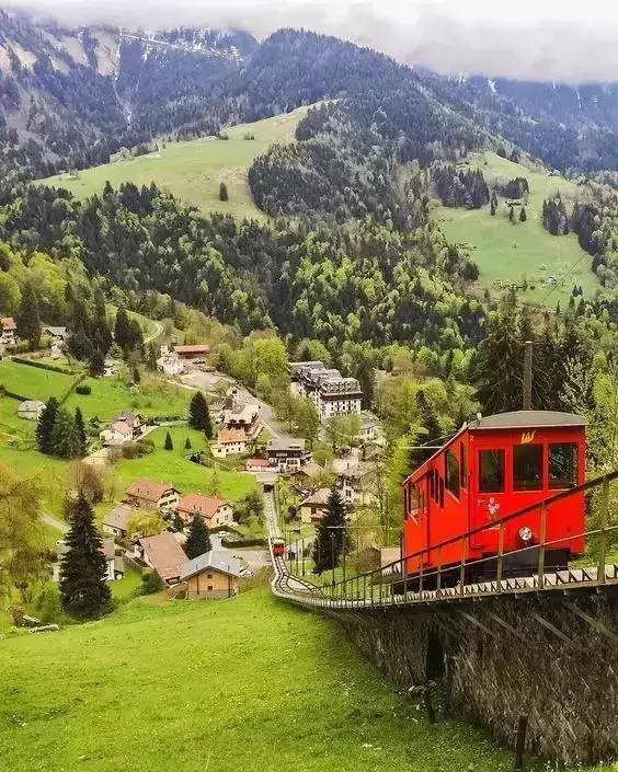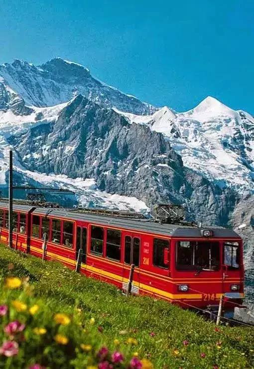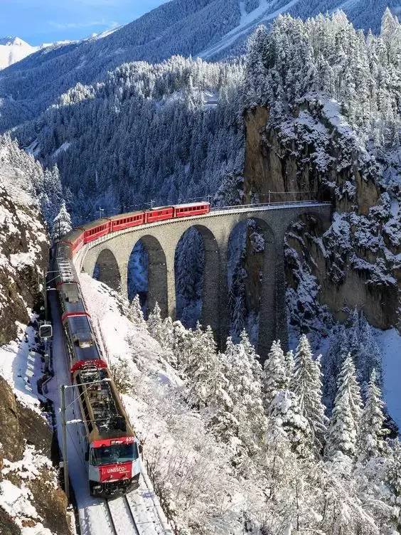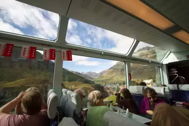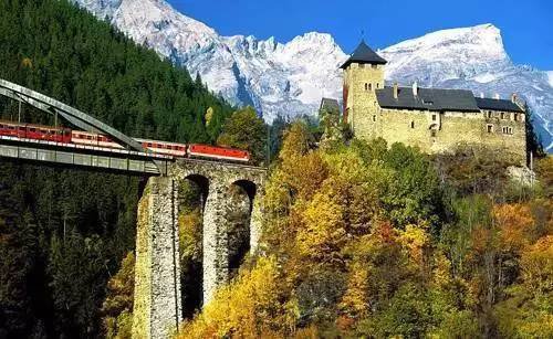 这列红白相间的火车,一路穿过了阿尔卑斯山口,走过 91 条隧道和 291 岛桥梁。车内全观景式的车厢,可 " 开启 " 阿尔卑斯山全景浏览模式,让你不会错过窗外的任何一处美景。