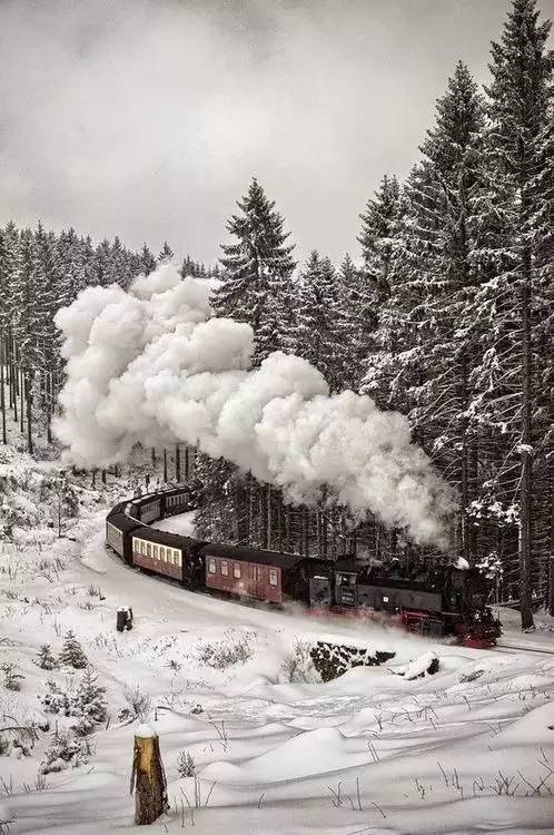 道轨的沿途,皆是笔直的参天杉树,远远望去一片黑压压。但当你接近这些黑色时,你会发现,积雪上的大片的墨色杉林,就像奶油上的巧克力一般美妙。