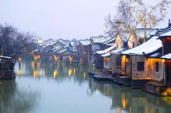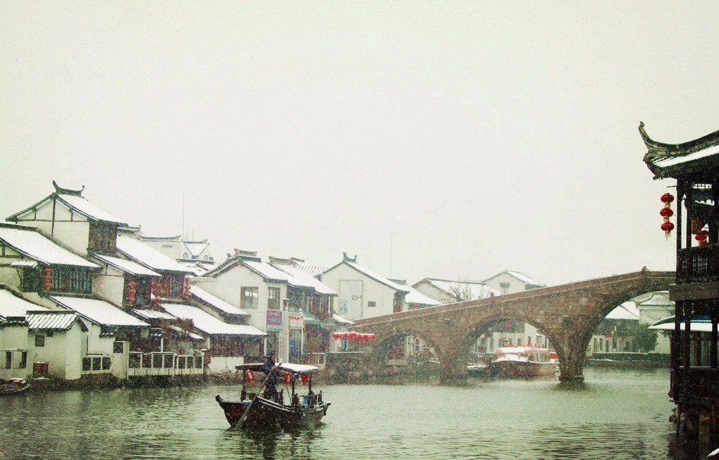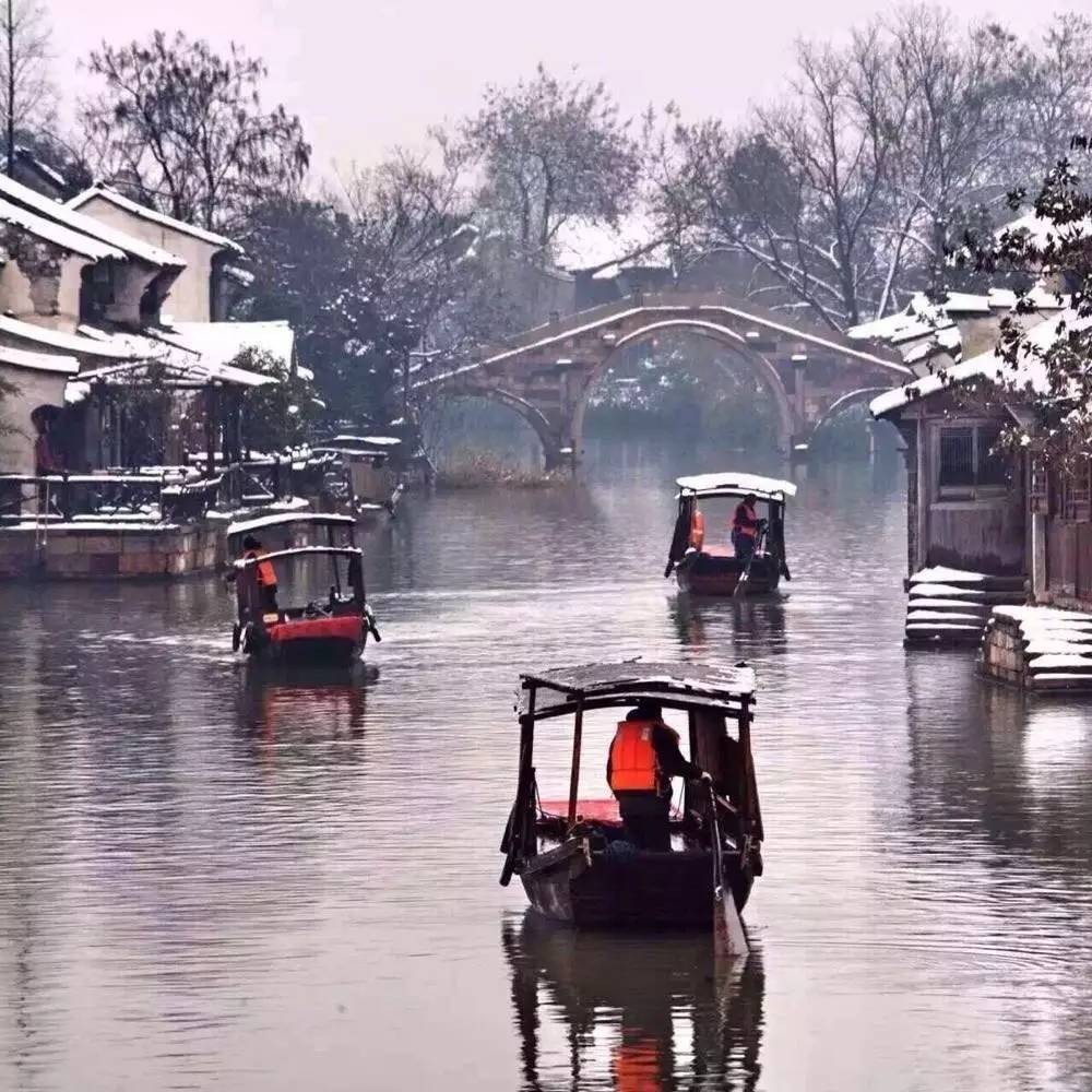 到了冬天,那就去下雪的古镇吧,坐上乌篷船,穿过银装素裹的古桥,沿岸白色屋顶,一眼就望穿了千年……