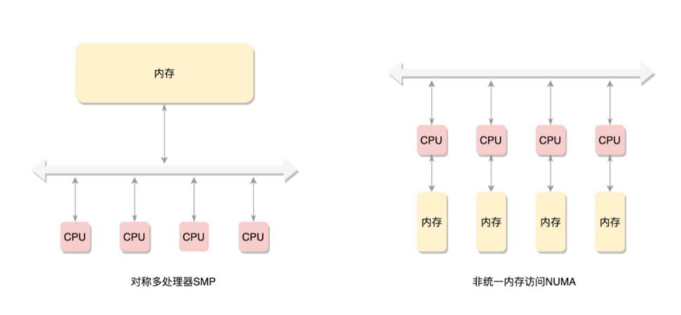 为了提高性能,有了一种更加高级的模式,NUMA(Non-uniform memory access),非一致内存访问。这种模式下,内存不是组成连续的一大块,而是每个CPU都有自己的一块内存,CPU访问内存不需要经过总线,所以速度上会更快,每个CPU和内存组成一个NUMA节点。但是在本地内存不足的情况下,每个CPU会去其他NUMA节点申请内存,此时内存的访问时间就比较长