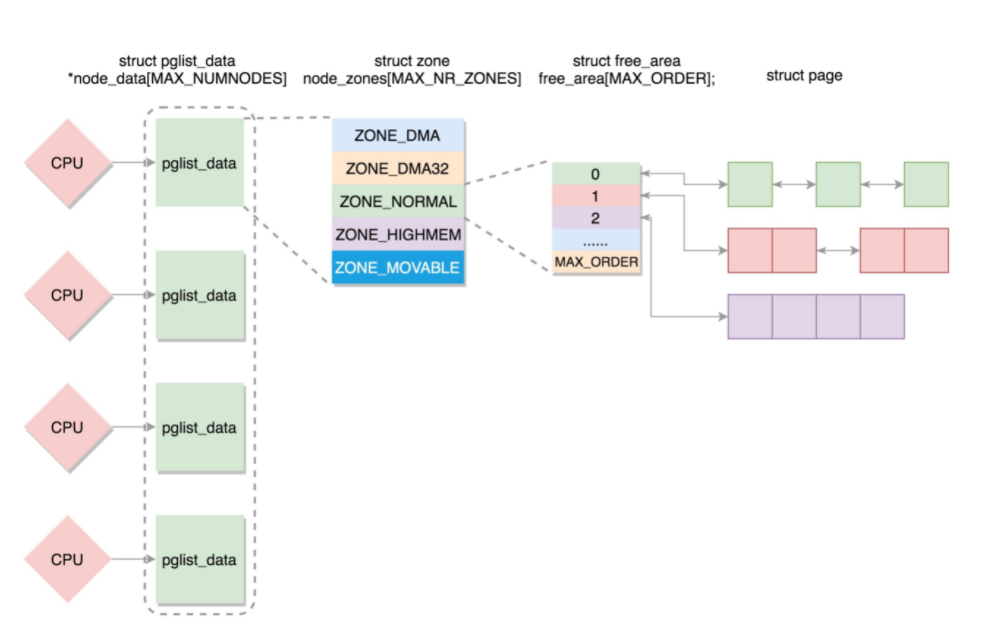 - ZONE_MOVABLE:可移动区域,通过将物理内存划分为可移动分配区域和不可移动分配区域来避免内存碎片
