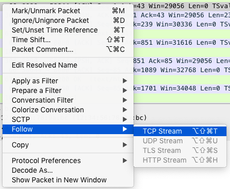 由于网络包的数量很多,我们可以先过滤一下。例如,选中一个包后,可以右键选择 “Follow”->“TCP Stream”,如下图: