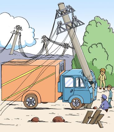 2、如果吊(货)车在行驶或作业过程中不慎误碰高压线路(由于是中性点不接地或小电流接地系统,35千伏以下高压线不会立刻跳闸断电),此时车子已经带上了高压电,千万不可强行拖拽驶离,以防拉断电线电杆造成更大伤亡,为了确保车内人员安全,最安全的做法是待在驾驶室内并立刻拨打“110”或“95598”报修电话,切记不可在不知道线路是否带电的情况下惊慌逃出驾驶室,这样很可能由于高压线路在肇事车辆壳体或地面产生的电压,造成人员触电。通常情况下,如果车辆挂住线路后一直带有高压电,因为车胎内有大量子午线钢帘,车轮部位因为巨大电流通过,会立即发生冒烟起火的情形,万一引燃车辆需要人员紧急撤离,应当打开车门观察环境后,以用力纵身跳出的方式,跳到尽量远的干燥地面,并采用单脚跳(或大步跳)的方式撤离至8米以外,注意不能摔倒在地面,或双脚均接触地面的正常行走方式,以防跨步电压伤害。