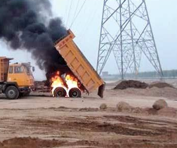 案例1:2010年8月18日,位于跑马山附近的一个养殖厂内,一辆停着的自卸车突然发生后溜,车上的吊臂直接挂住上方的一根35千伏高压线后,车轮很快就冒烟燃烧。在远处避雨的驾驶员飞奔过去想把车移开,当他的手才碰到车门的一瞬间,“呯”的一声就触电倒地,当场不幸身亡。