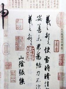https://pic.baike.soso.com/ugc/baikepic2/67687/20160730100411-306667620.jpg/300赵孟頫跋《快雪时晴帖》(3)《快雪时晴帖》帖幅前有“廷”印,后有“绍兴”联玺,又“褚”半印。此帖唐初赐丞相魏徵,传于褚遂良。宋初为铜山苏舜元、苏舜钦兄弟所得。苏氏世代仕宦,收藏宏富,仅此帖就有三本。米芾易得一本于苏激处,为有“褚”印者(宋代刘泾易得一本为无“褚”印者。宣和内府曾收藏此帖,《宣和书谱》著录帖目)。南宋初入高宗内府。明代由朱存良藏,后由卖画者售与王穉登,以后转手吴国廷、刘承禧。刘卒后又归吴国廷。元朝时先为张氏所有,后入元内府。其后为涿鹿冯铨所得。