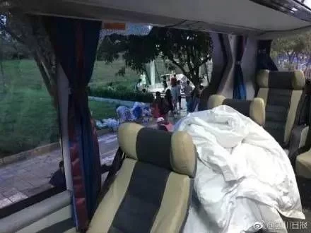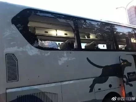 夜幕将至,这是九寨旅游团队返回成都动物园集散地的第16辆大巴。这辆大巴的后车窗被落石砸中,整块玻璃碎成一地,当时坐在这个窗边的是一对来自浙江的小情侣,女孩名叫曾雅静,是位老师,她和男朋友黄伟(化名)趁暑假来