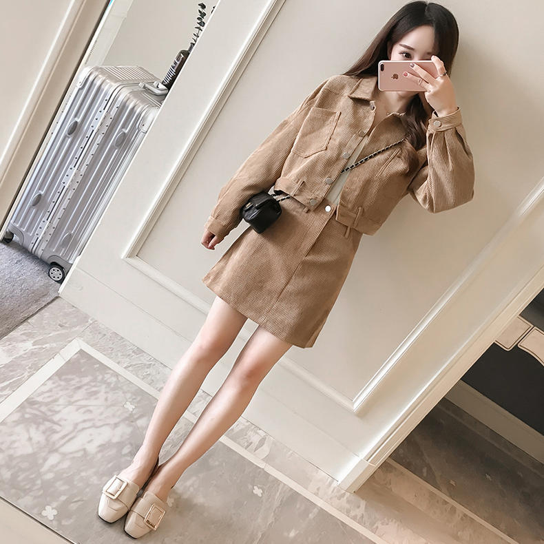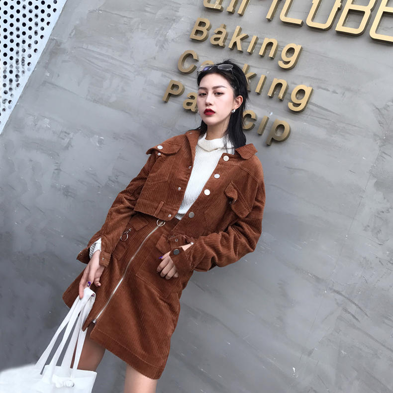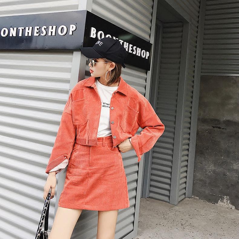 这款亮丽的灯芯绒套装足够让你出彩,上衣走的是休闲随性风的夹克,简洁的立领干练精神,特显气质宽松短款的版型,不仅包容性更好而且能够拉长下半身的比例,显高显腿长下装是高腰A字裙,轻松百搭又好穿,鲜艳的桔红色青春靓丽,活力满满一套上身就让你成为秋日最亮丽的风景线!