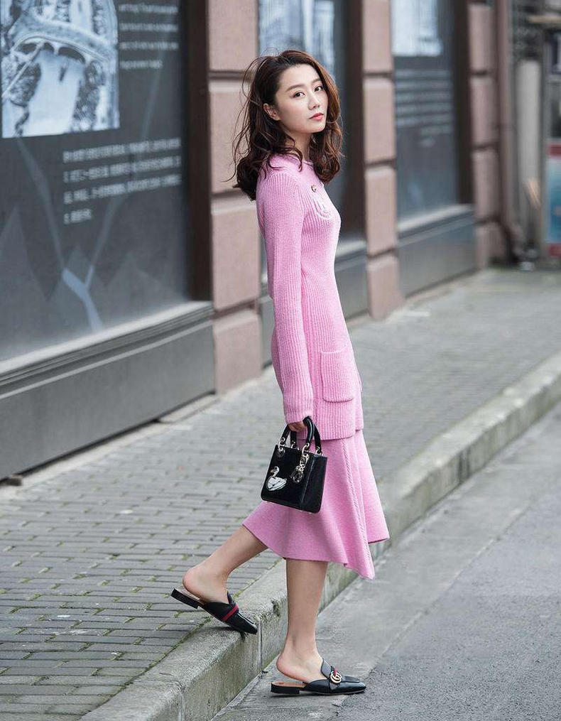 粉色的针织连衣裙,少女心爆棚有木有。款式减龄修身,浅色感觉还是比较适合身材线条比较柔美的女生。一身浅色连衣裙搭配深色乐福鞋,随意凹造型都有一种街拍的气质。