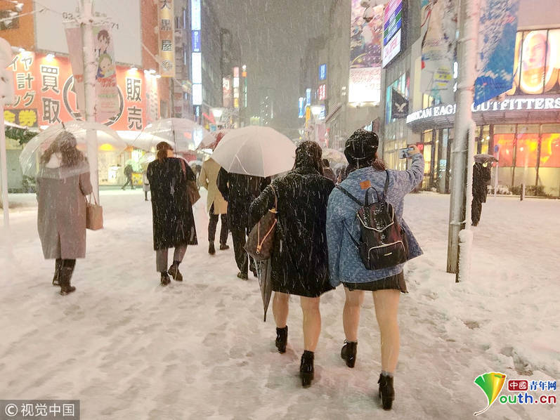 日本气象部门表示,由于受强烈低气压影响,东京首都圈地区从周一(22日)早上开始降雪,部分地区翌早降雪料达20厘米以上,影响铁路运输。这是东京时隔4年发布大雪警报,羽田机场交通大乱,逾200班内陆线航班延误或取消,影响超过1.5万人。而在池袋阳光城附近的马路上,多名高中女生依旧穿着短裙,光着大腿在雪地上行走,并自拍留念。这样的大雪天穿短裙露大腿,日本女生难道真的不冷吗?(来源:中国青年网)