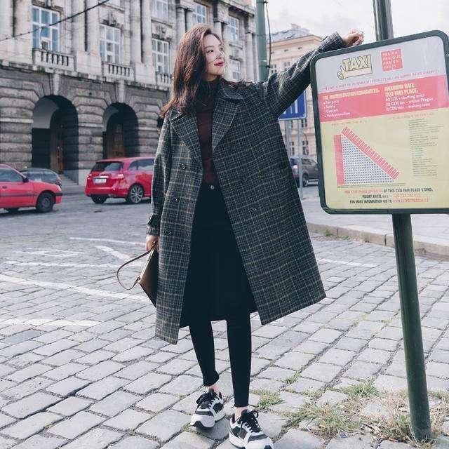 深色系列的格子呢大衣,特别适合这个越来越冷的冬天。西装领设计,多了一丝干练的味道。内搭白色高领,很复古很优雅