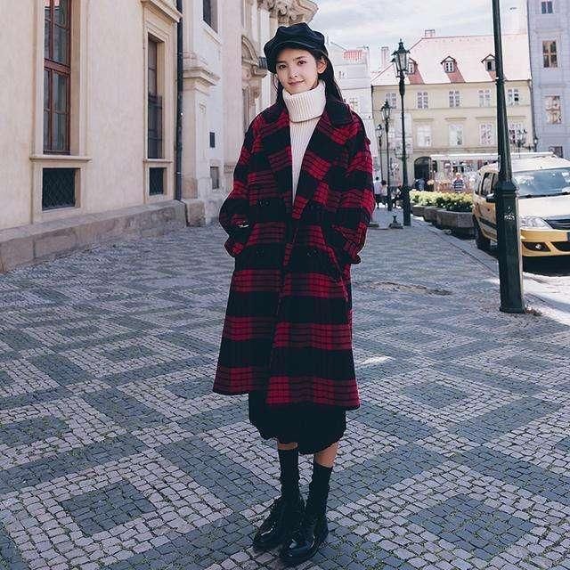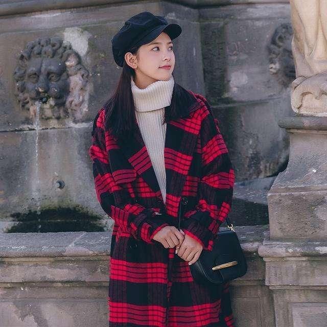 这款大衣红色的双排扣对襟设计彰显出流畅的线条,复古色调交织出来的格纹使大衣简约大方,随心搭配出优雅范。