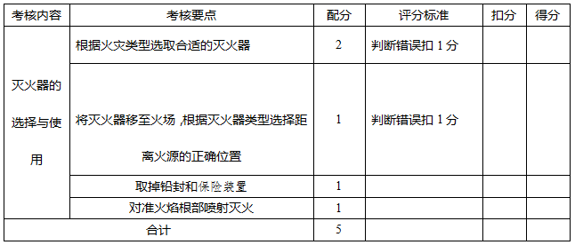 2.考核要求:能根据不同火灾类型正确选择合适的灭火器并使用灭火器。