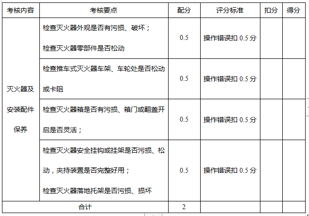 2.考核要求:能熟练掌握灭火器及安装配件的保养内容和方法。