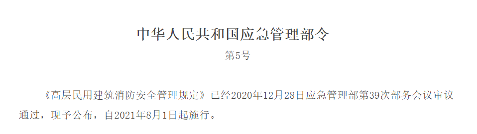 https://mmbiz.qpic.cn/mmbiz_png/F6wKGmt5Rhh6oSGN8ryRwPU3jyv3feJwMJYhkW3icictPxLYLZ0akESfgoEwJxlOvKMUWqukpibIfSCKzPTFjrnxw/640?wx_fmt=png&wxfrom=5&wx_lazy=1&wx_co=1应急管理部发布中华人民共和国应急管理部令第5号:《高层民用建筑消防安全管理规定》已经2020年12月28日应急管理部第39次部务会议审议通过,现予公布,自2021年8月1日起施行。