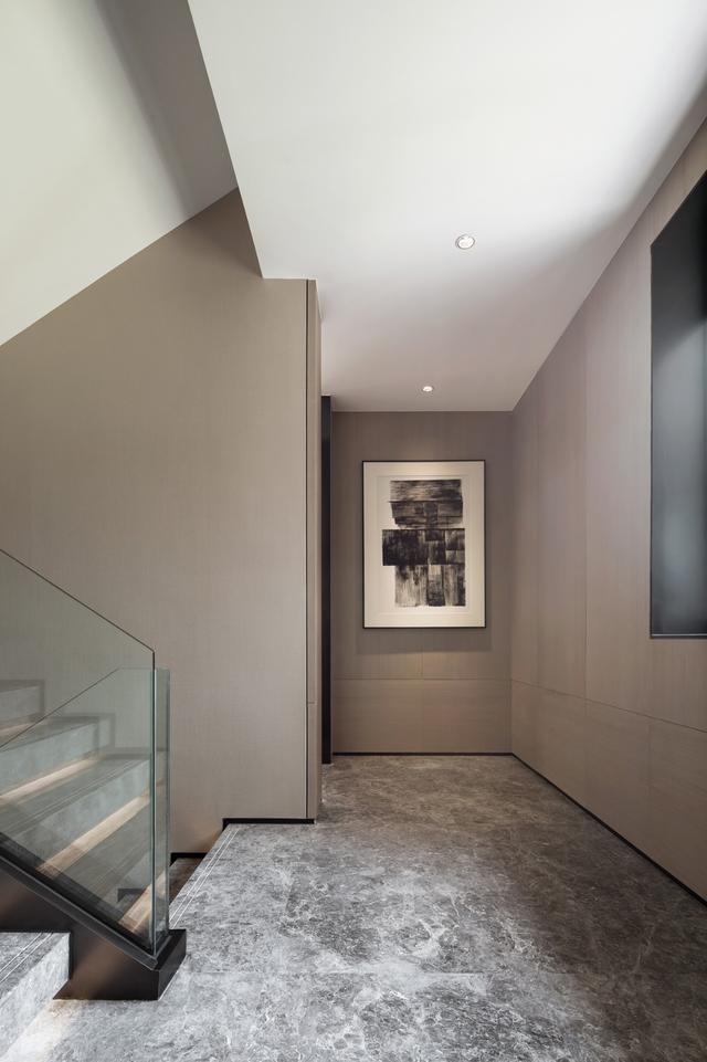 选材克制,用色纯粹,不同灰度的主基调下融入略带温情的大地色系,深浅明度的变化是其中的亮点所在,再点缀低饱和度的拉丝黄古铜与橙灰色作为辅色,使空间的色彩搭配具有层次感。