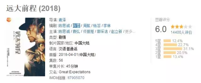 拿4月初就登陆湖南卫视金鹰独播剧场的《远大前程》来说,虽然汇集了一众老戏骨,题材也是非常容易出精品的权谋剧,但不仅前期没掀起什么水花,后期也没能逆袭成功,收视率几乎没破过 1,豆瓣上仅有 1 万多人给它打出了 6.0 这样不尴不尬的分数。