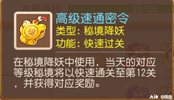 - 高级速通密令/速通密令,这个可以助少侠快速通关秘境的前几关,高级的是12关,普通的是6关。(排行规则和奖励稍后会说)