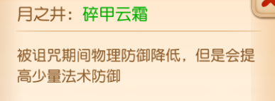 - 碎甲云霜:被诅咒期间物理防御降低,但会提升少量法术防御