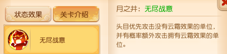 - 无尽战意:主怪会优先攻击没有云霜的单位,并且有概率对云霜单位进行追击(不过因为是第一二关出现的无尽战意都是一回合击杀,所以并未见这个无尽战意追加的是普通攻击还是技能攻击)