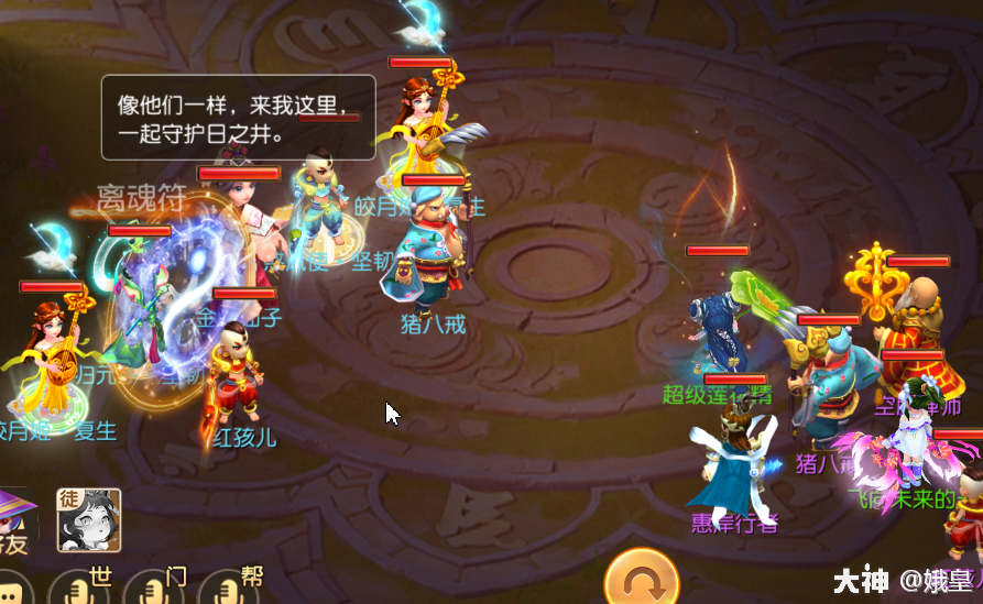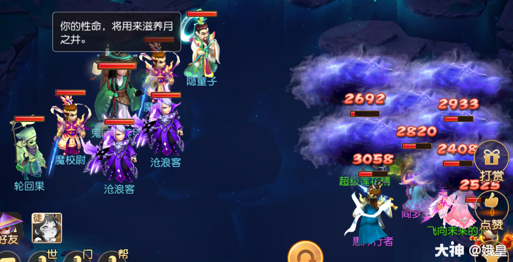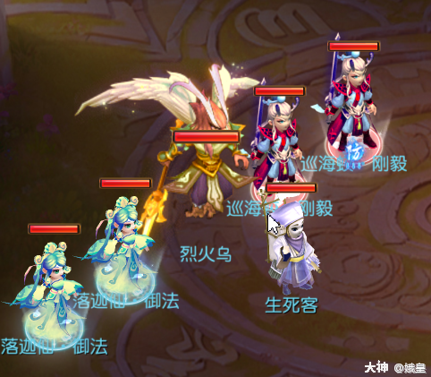 30关,鬼医。进入战斗先给个重云破击,全队掉一半左右气血。这关有罗汉就好打,前面那个龙宫法伤还挺高,不过不知道是不是因为我的助战没有培养缘故,所以比较脆。主怪边上的两个魔校尉是轼神的大唐,只要击杀目标,百分百触发。我没有特技,所以我先封主然后一直开隐或者大招。