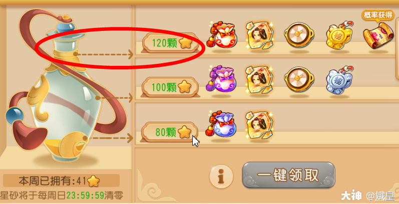 一周只能领一次,星砂将于每周日晚12点清零,记得领取哦