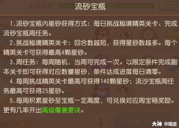 二、和老秘境一样,每几个小关就有一个大关,每一个大关通关后结算星砂和宝箱奖励以及少量金币。