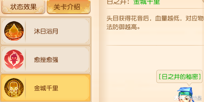 - 金城千里:主怪获得花音后,血量越低,防御越高。但我不知道“对应”两个字什么意思。