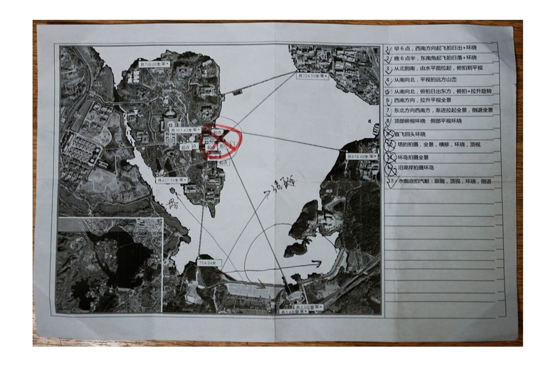 这张是我当时去之前打印出来的航线规划图,图的右边我标注了我想拍的一些镜头,但是很遗憾,因为首次航拍手太潮,一丢图传我就紧张,握摇杆的手都哆嗦,所以有几条没能拍完。