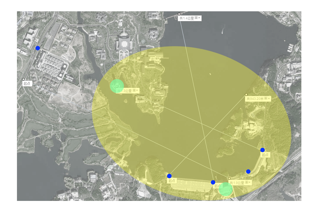 等到了地方,雁栖湖北岸的雁栖酒店里不许起飞,那么只剩下日出东方酒店下那条堤坝上可以起飞了。蓝色是几个起飞点,黄色是飞行区域,基本是在方圆1.5公里之内。浅蓝色的点就是高塔和日出东方酒店的位置。