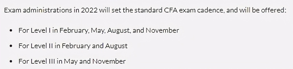 首先,2022年四个CFA考季依旧为2月、5月、8月及11月,但CFA二级举行月份与2021年相比有所区别。