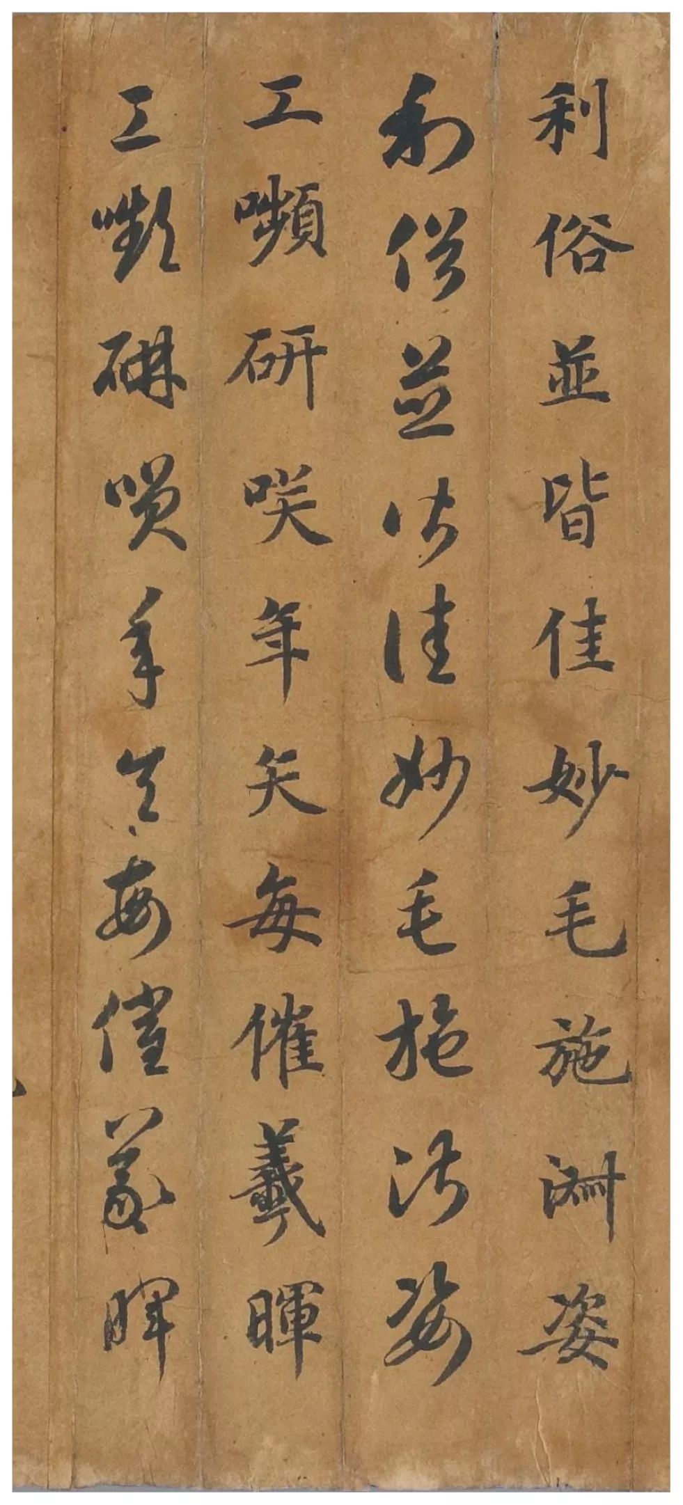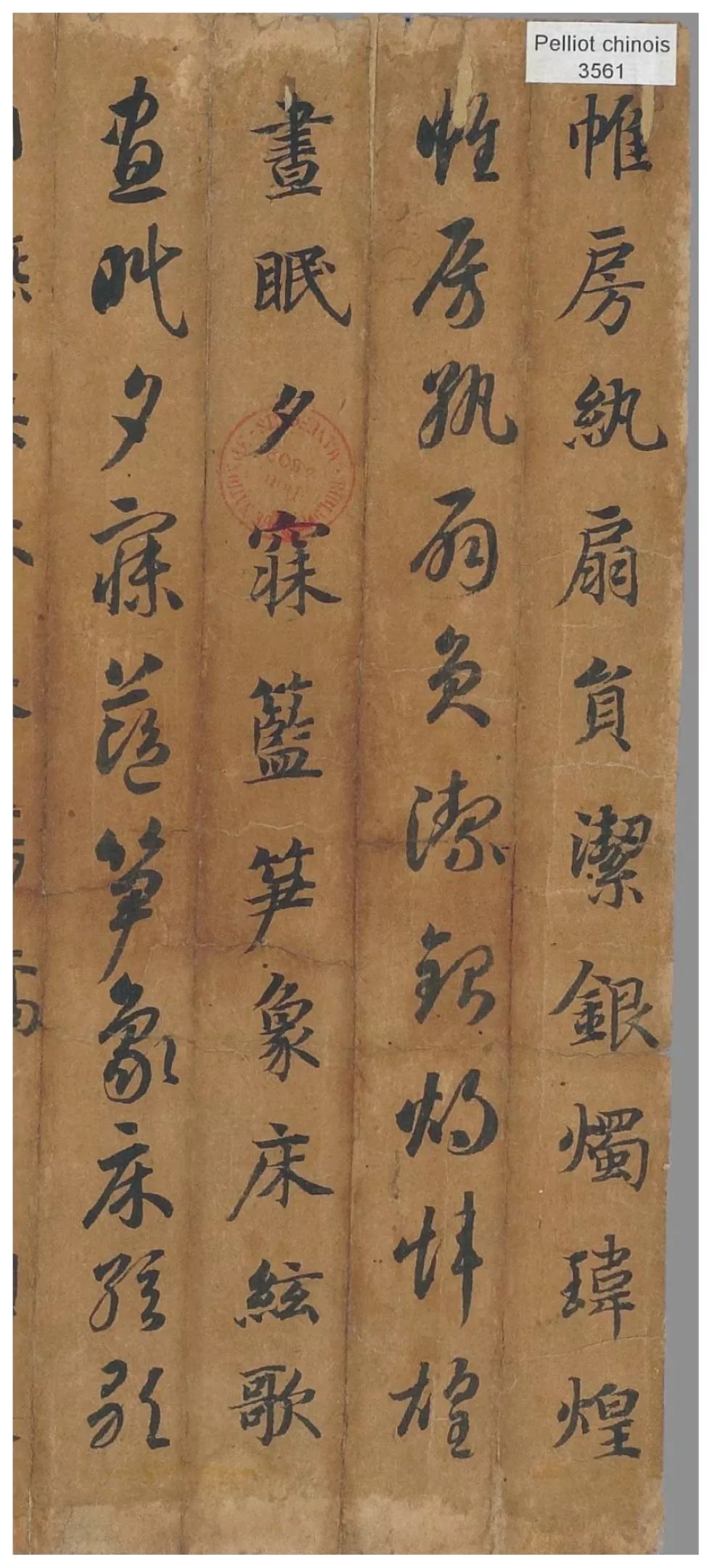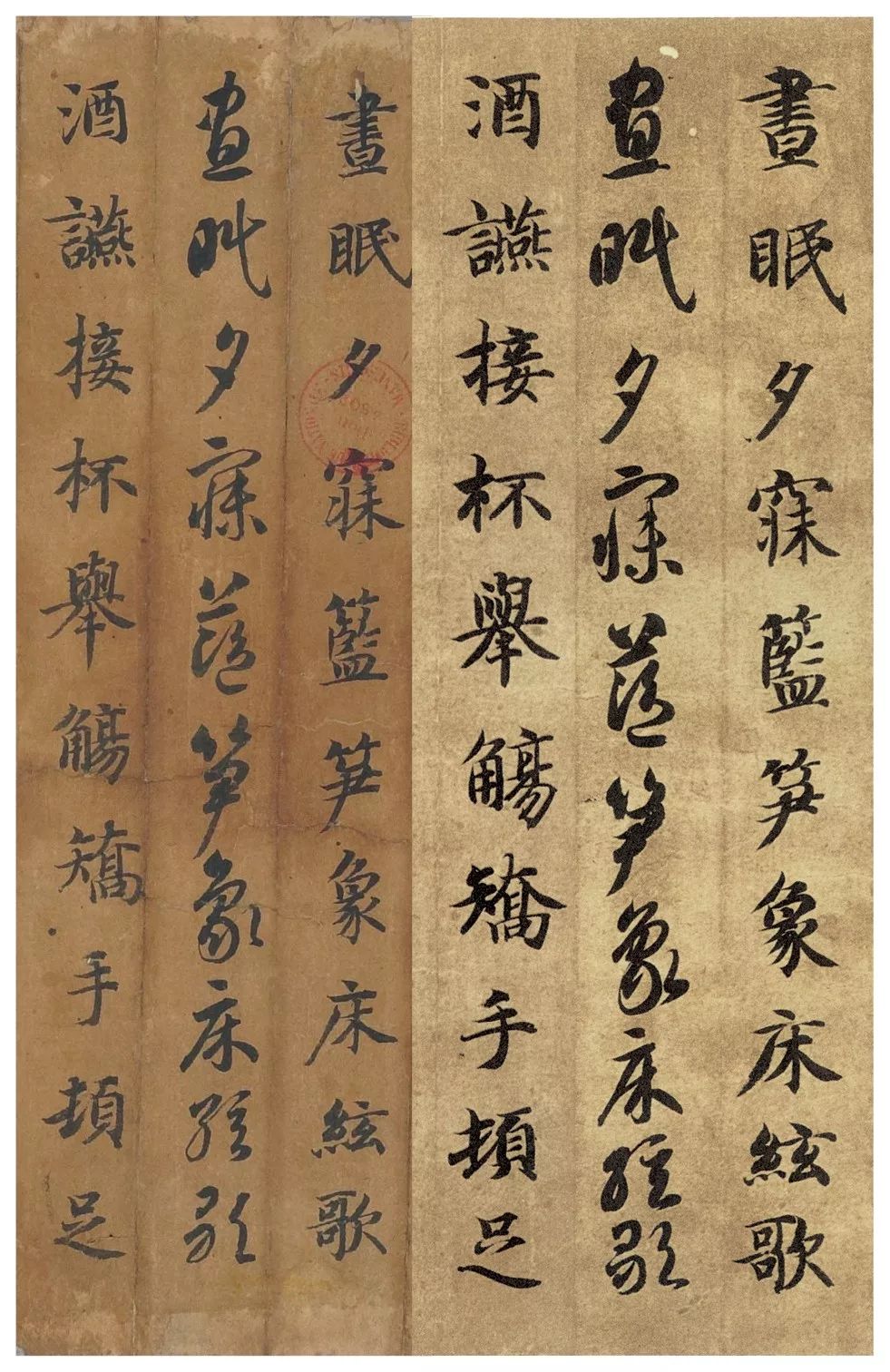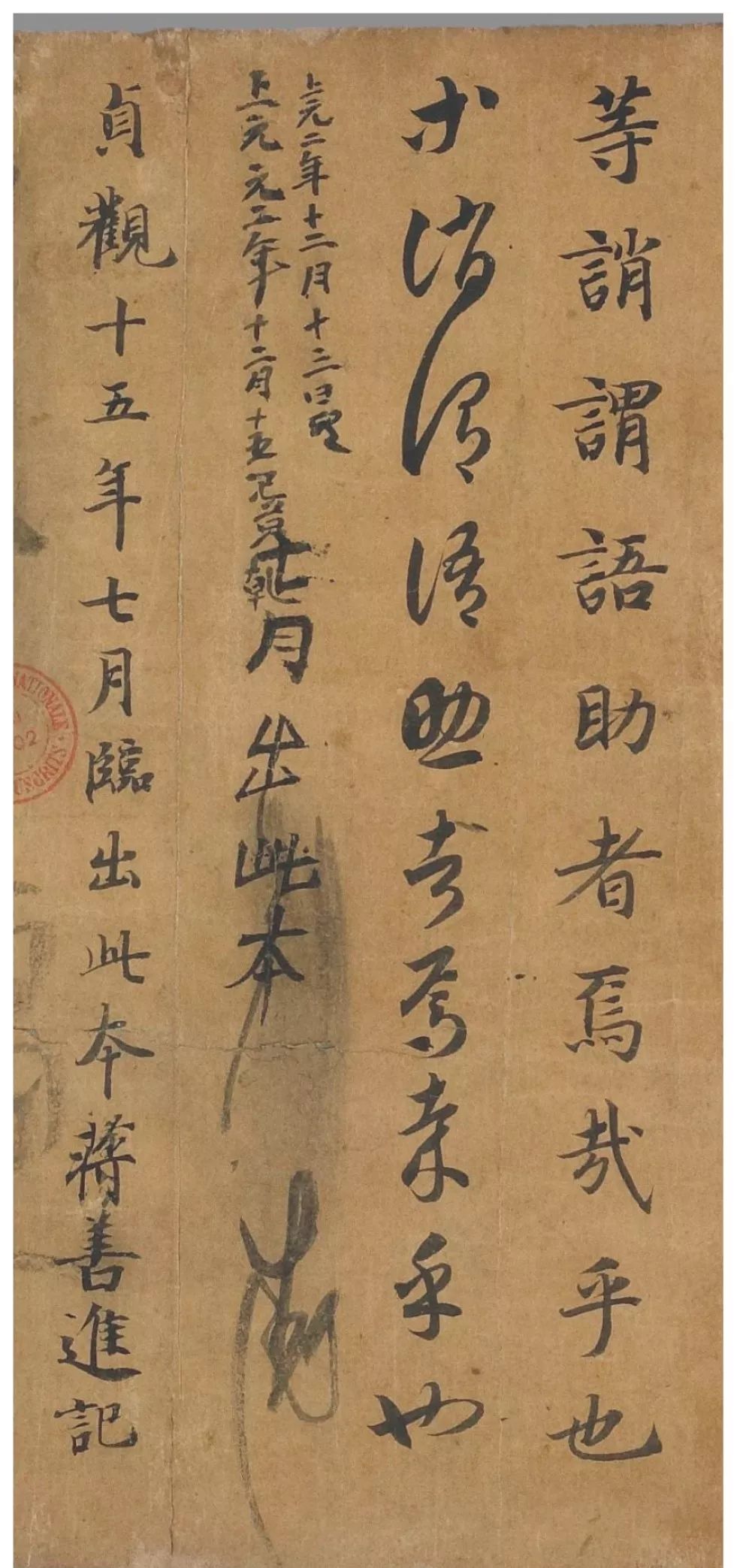 智永《真草千字文》临本,唐蒋善进临。高25厘米,宽102厘米,茶色楮纸本。残存卷尾部分,自“(侍巾)帷房”至“焉哉乎也”,真草书各三十四行,凡一百七十字。卷中有拼接。卷末正文后有“贞观十五年(641)七月临出此本,蒋善进记”十五字,楷书,题记两侧的空白处有后人加写的“上元二年”等字迹以及涂抹改动之墨痕。