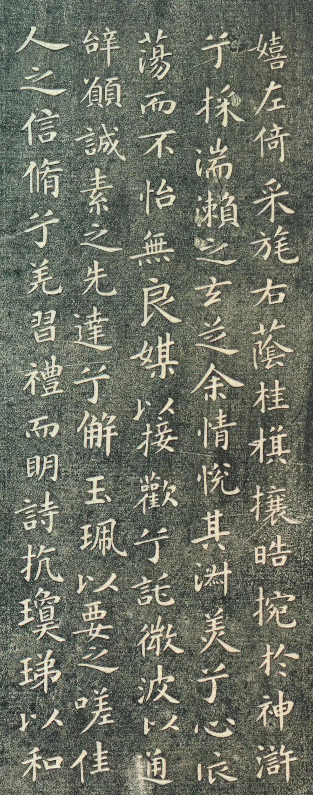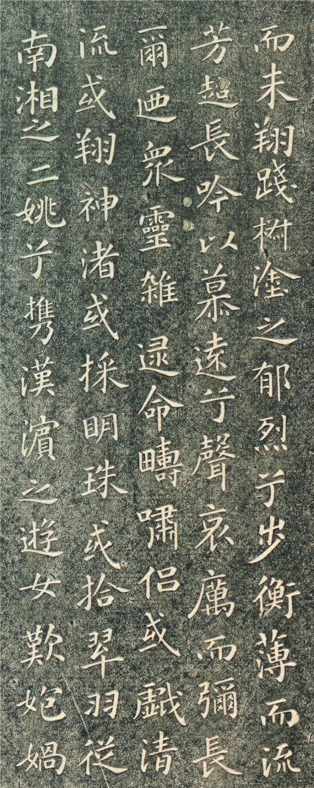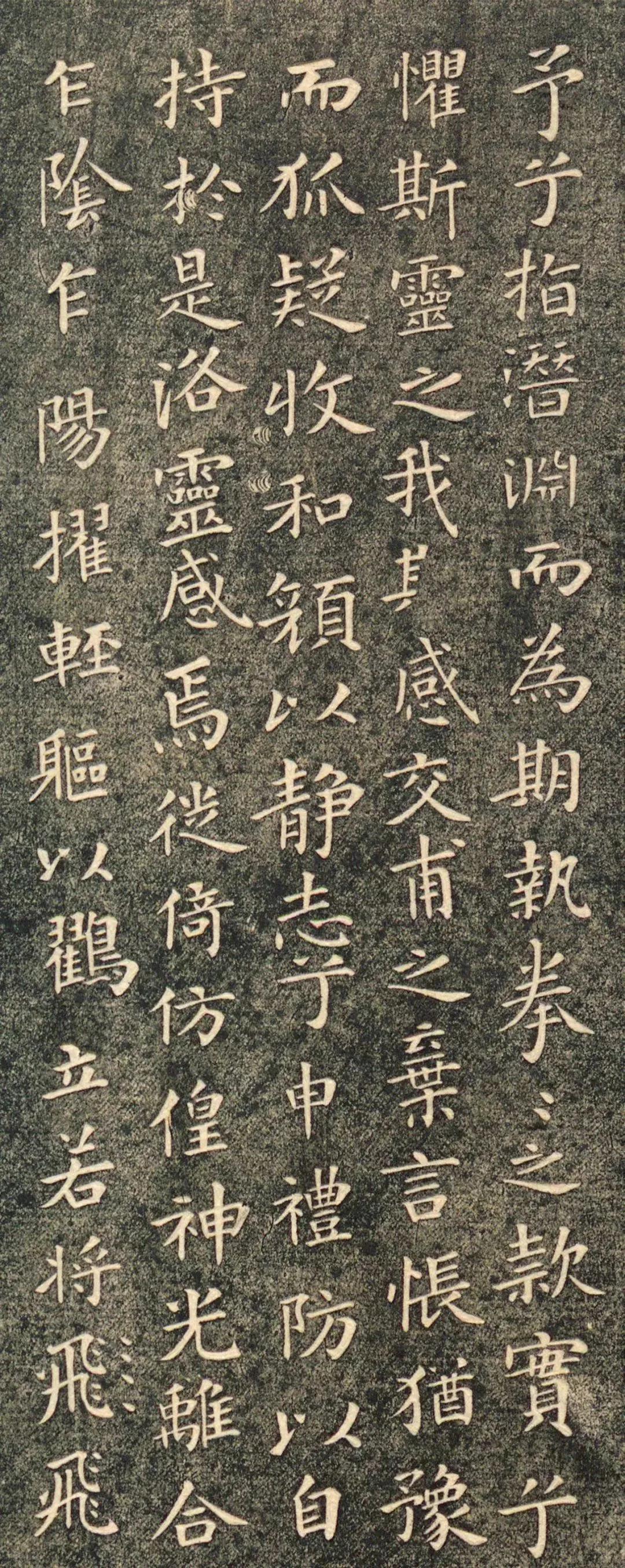 王献之《洛神赋》被誉为小楷极则,其结体匀称和谐,宽绰舒展;姿态妩媚雍容;笔致洒脱,轻松优雅,神采飞扬,清爽健利,奕奕动人。字的大小差异,字距、行距变化自然,给人以“大珠小珠落玉盘”的玲珑美。从线条角度分析,其均匀纤细的点画中蕴涵着极强的质感,雅逸秀丽、不臃不滑,可谓精丽绝伦。