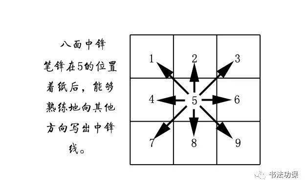 我们要求所谓熟练的中锋线,是指八个方向的中锋线,这跟米芾说的“八面出锋”略有差别。米芾的八面出锋涉及的有调锋的概念,我们这里要求的是向八个方向熟练写出中锋线,是初级入门版的“八面锋”。如图:
