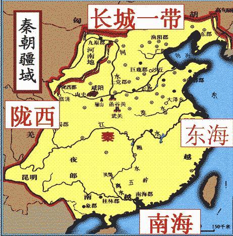 疆域到达长江流域以南的地带。 秦朝初立便北击匈奴收河套,又派遣屠睢率领50万秦军平定百越,疆域面积迅速扩展,达340万平方公里左右 ,全盛疆域东起辽东、西抵高原、南据岭南、北达阴山,。