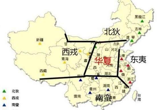 周朝把华夏周围四方的人,分别称为东夷、南蛮、西戎、北狄。随着历史发展,疆域扩大,原来的东夷和南蛮地区逐渐成为中原王朝的组成部分。从秦朝起,影响中原王朝的主要是西戎和北狄。
