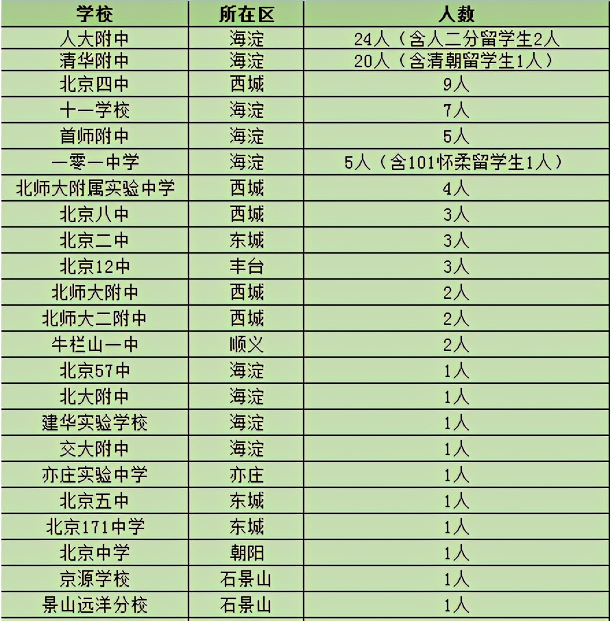 人数超过2人的学校还有:十一学校、首师附中、101中学、北师大附属实验学校、北京八中、北京二中、北京12中。