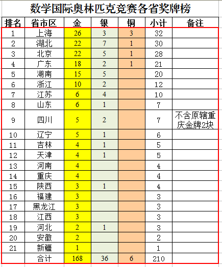 2021年的国际奥数(IMO)刚刚比赛完,截至目前,我国奥数奖牌榜更新后的数据如下: