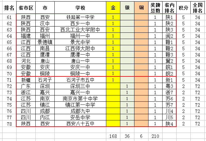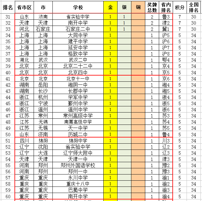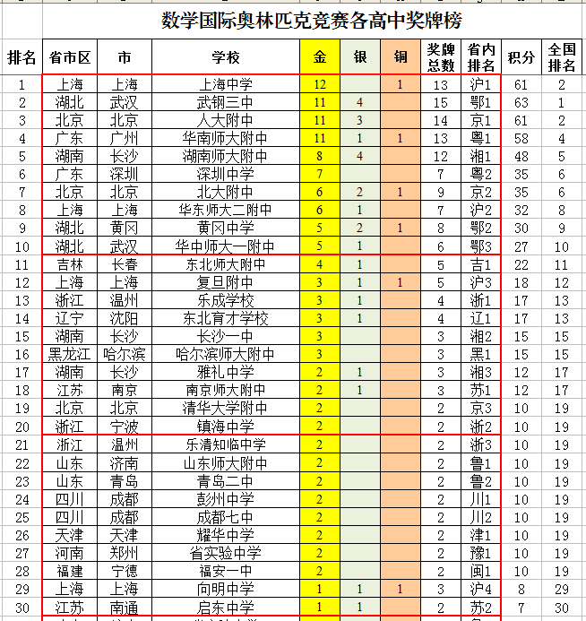 高中方面,上海、湖北、北京、广东各一所学校超过10金,即上海中学12金,武钢三中、人大附中、华南师大附中各11金。但是上海中学、武钢三中已经没有以往的锐气了,尤其是武钢三中,现在好几年才能进一次国家队,以前一年3人进国家队的辉煌估计再也不可能出现了。
