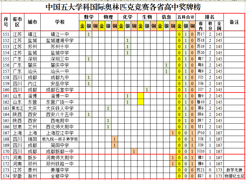 截至目前,全国共计有174所高中参加过五大学科国际奥林匹克竞赛,其中的172所高中拿过奖牌,有2所学校有过参赛经历但是没有得牌(江苏姜堰中学•数学、安徽全椒中学•物理)。拿过金牌的高中一共有23省市区的140所,参赛过的省市区中仅仅只有甘肃的高中没有拿过金牌。