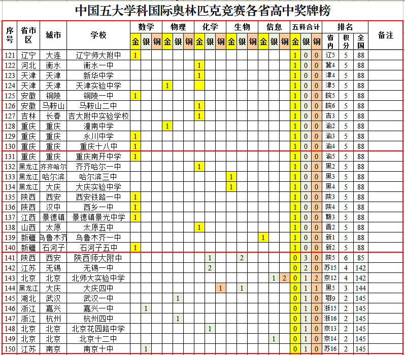 南开中学和山东省实验实现了3科金+1科牌,南开信息缺金牌、生物缺奖牌,山东省实验物理缺金牌、信息缺奖牌。