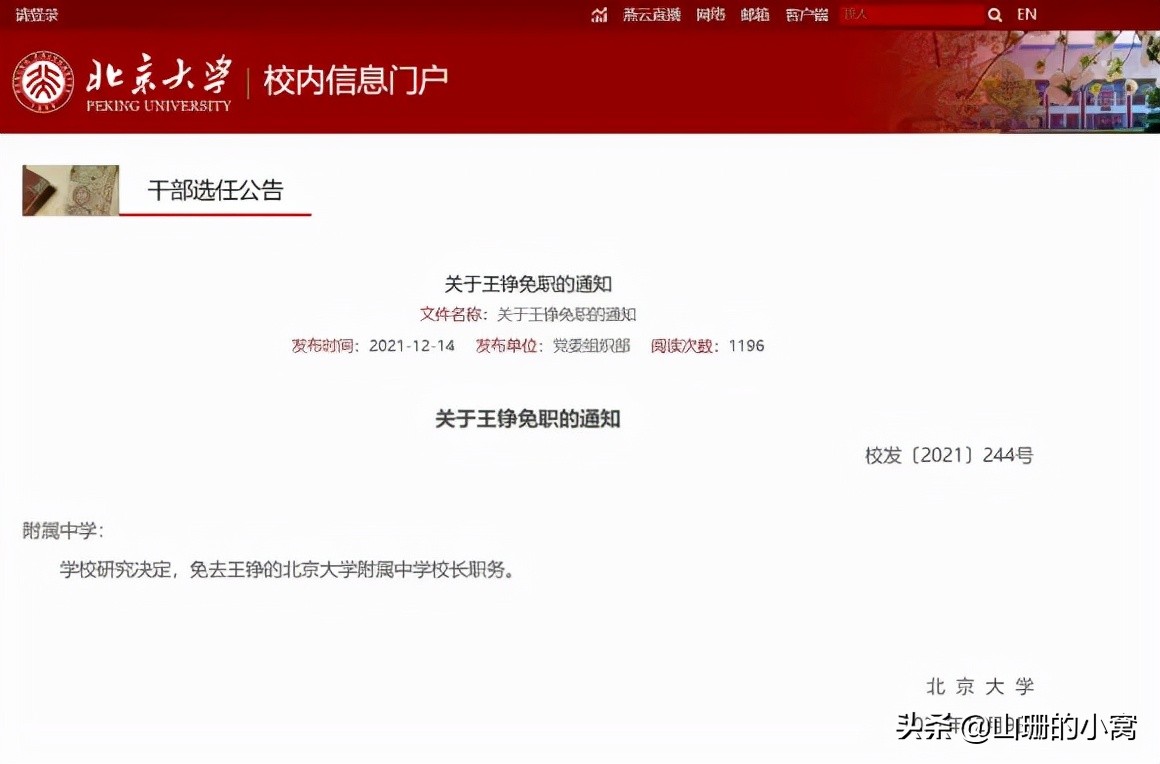 通知非常简短,全文只有一句话:“附属中学:学校研究决定,免去王铮的北京大学附属中学校长职务。”落款为北京大学,时间为2021年12月9日。