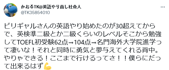 https://p3.toutiaoimg.com/origin/tos-cn-i-tjoges91tu/T2rLJUFDC4BsvX?from=pc“沙耶加30多岁才开始重拾英语,从英语二级的水平开始学习,最后托福成绩从62分提升至104分,进入世界名校,好厉害啊!她的故事带给了我勇气和梦想。努力就能成功!沙耶加能做到我们也可以!”