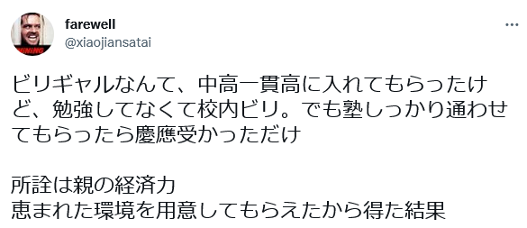 https://p3.toutiaoimg.com/origin/tos-cn-i-tjoges91tu/T2rLJwACIXWdMe?from=pc“虽然垫底辣妹初高中上的都是不错的学校,但是因为不学习成绩垫底,又通过好好补习考入了庆应。说到底还是父母有经济实力,就是在良好的环境中取得的成果。”