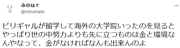 https://p3.toutiaoimg.com/origin/tos-cn-i-tjoges91tu/T2rLJyc6WZ4qX4?from=pc“垫底辣妹能去国外上研究生,可以看出金钱和环境比努力更重要,没有钱什么都干不了。”