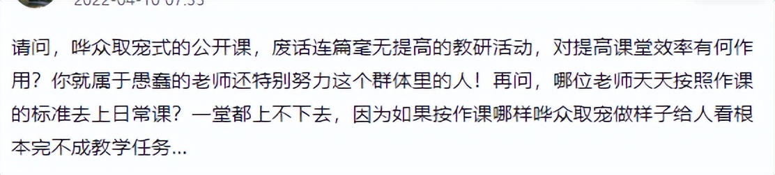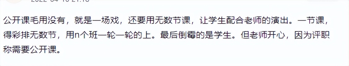 网友一:公开课真没用,就是一场戏,还要耽误无数节课的时间,让学生配合老师的演出。一节课,得彩排无数节,用n个班级,一轮又一轮的演练。最后倒霉的还是学生;老师开心,因为评职称需要啊!其实学生也讨厌老师公开课的样子!觉得老师好假!然后不尊重!