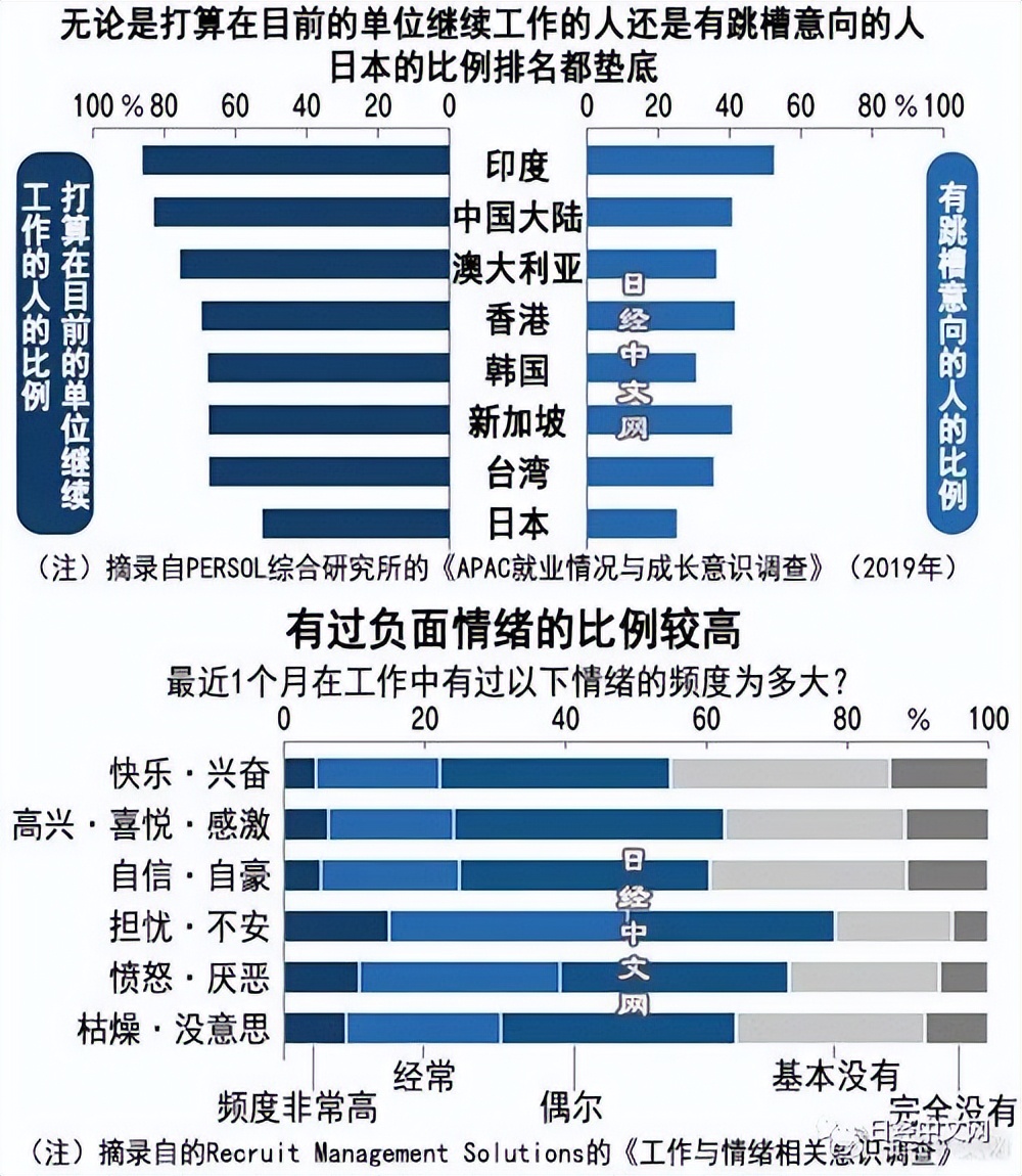日本PERSOL综合研究所以14个亚太国家和地区为对象实施的调查显示,无论是“打算在目前的单位继续工作的人”,还是“有跳槽意向的人”,日本的比例均为最低。也就是说,虽然日本人对现在的工作没有什么留恋,但也没有足够的干劲摆脱这份工作,投入到新天地里。这一结果反映出日本的职场人士缺乏朝气。