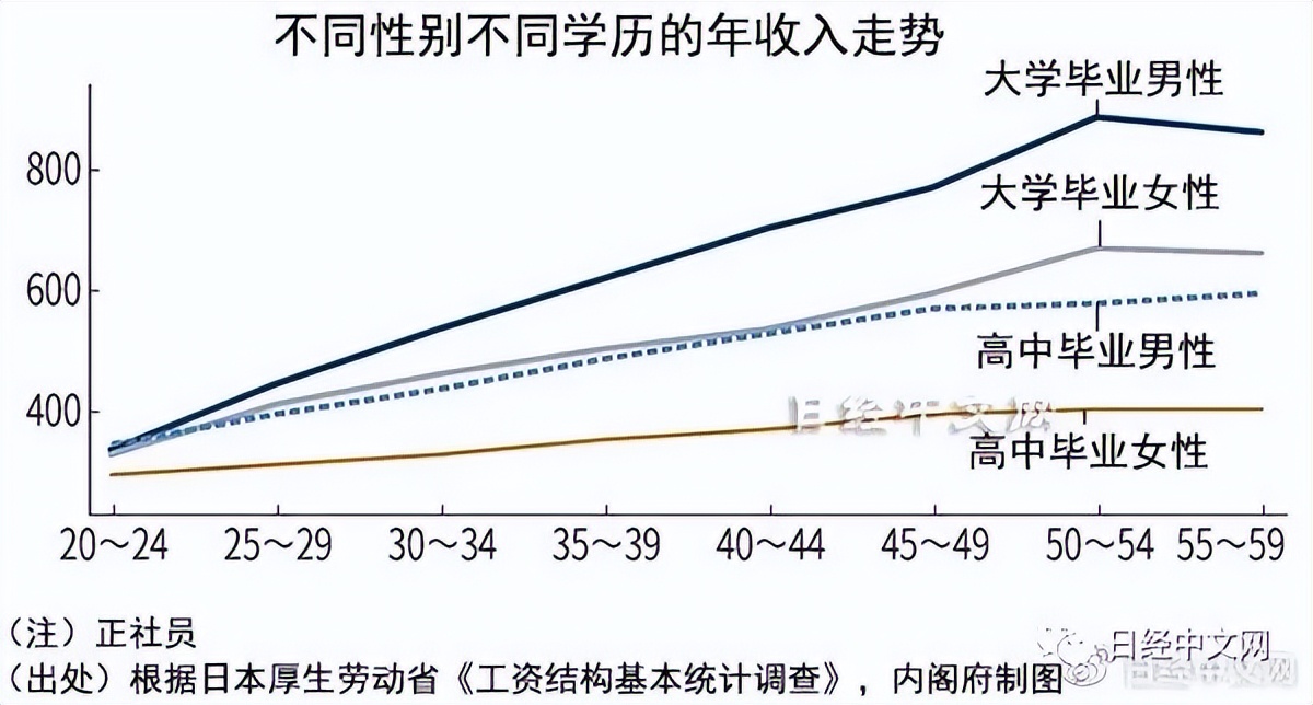 大学毕业女性的工资发展水平反而跟高中毕业男性相似。大学和研究生毕业的正式员工,男性收入为2亿6920万日元,女性为2亿1670万日元,相差5250万日元。出席委员提出的意见是:“即使同样培养儿子和女儿,让他们升入了大学,只有女儿吃亏的社会真的好吗?只有绝望”。