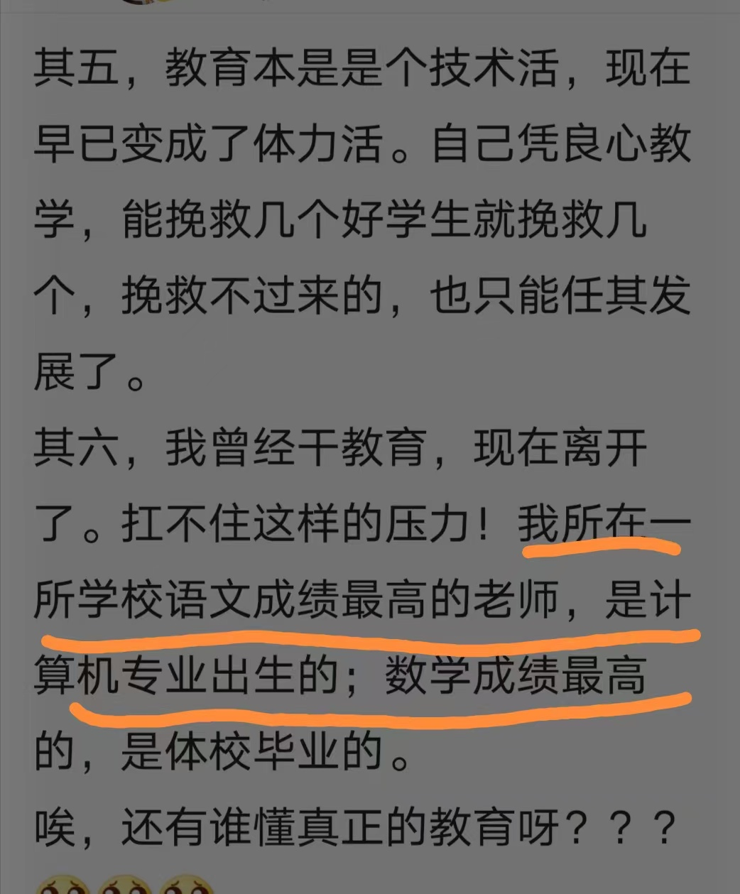 最近一位老师在网上反映:我所在的学校语文成绩最好的老师,是计算机专业出身的;数学成绩最高的老师,是体校毕业的。